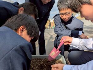 【中学】1年生の生徒たちが、家庭科の授業で、来年度の新入生のためにチューリップを植えてくれました。