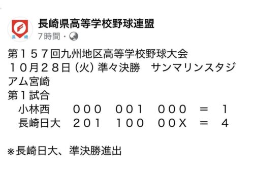 【高校】九州地区高校野球大会(10/28) 準々決勝戦に勝利し、ベスト4進出