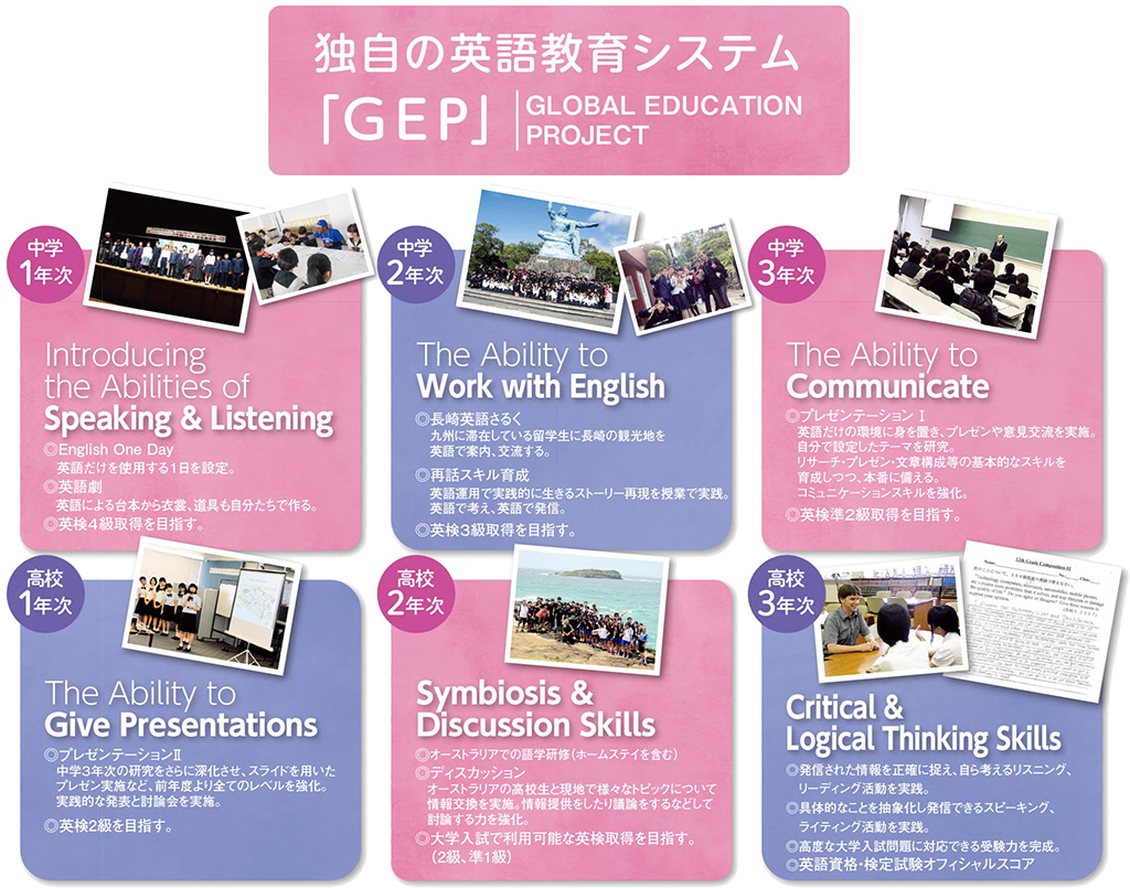 6年間で、リーダーとして国際社会に貢献できる人間を育成します。 GEPは、国際社会において活躍することを目指したプロジェクトであり、互いの文化や歴史を尊重し、温かい人間関係を構築していくための基礎を創ることを目指しています。 中学1年次の「英語劇」や「English One Day」に始まり、年度ごとのテーマ設定に応じた「プレゼンテーションやディスカッションの研修」を重ねていきます。毎年設定されている外国人留学生との交流を通して、「ツールとしての英語力」にも磨きをかけていきます。 具体的には、的確に自分の意見を他者に伝え、また他者の意見を柔軟に受け入れられる姿勢を育みます。そして、それに応じた思考力の向上を常に目指しています。