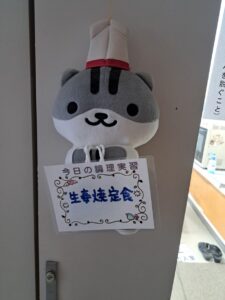 香りをたよりに近づいていくと、家庭科教室での調理実習であった。ドアにかかったぬいぐるみのコックさんによると「しょうが焼き定食」とある。なるほど良い香りがするはずである。