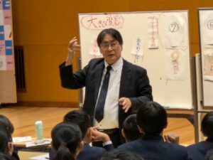 はりきって授業に取り組んでくれた中学1年生の皆さん、お疲れ様、ありがとう。二瓶先生も褒めてましたよ。