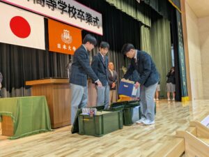 式練習の後は、同窓会入会式や記念品贈呈式、表彰、タイムカプセル保管式など、卒業式前日の恒例行事が行われ、いよいよだなぁと気分が高まってくる。放送部の3年生の皆さんが置き土産として制作してくれた「卒業記念」の映像が流れると「うるっ」と来てしまう吾輩であった。生徒さん、先生たちも同様であろう。