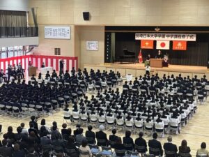 本日、中学校課程を修了する皆さん、本日は、中学校卒業の節目となる場面です。本当におめでとうございます。そして、皆さんが3年前に登り始めた「長崎日大という坂道」は、まだまだ続きます。