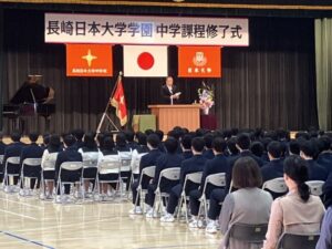 昨日の第3学期終業式の後、午後からは、長崎日大中学校の卒業式にあたる「中学校課程修了式」が開催された。