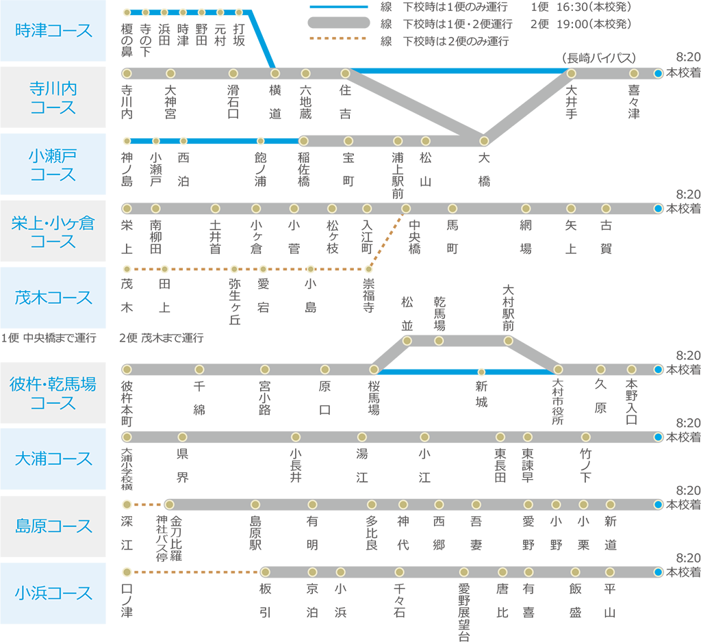 通学生の便宜を図るため、長崎・大村・島原・小浜・大浦(佐賀県)から19台のスクールバスを運行しています。また、終業直後に出発する1便のほか、進学講座、部活動の終了に合わせ、各方面に第2便を運行しています。